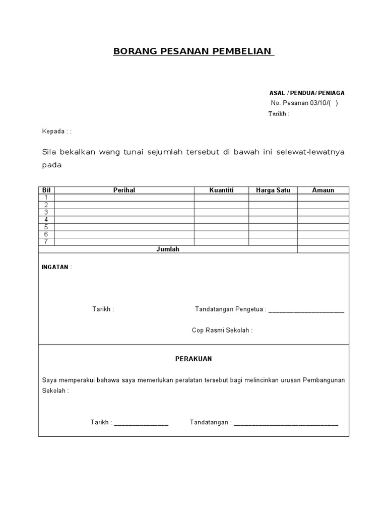 Borang pesanan pembelian asal pendua peniaga no. Dengan hormat Menindaklanjuti surat penawaran Saudara No. Contoh Borang Pesanan Tetap.